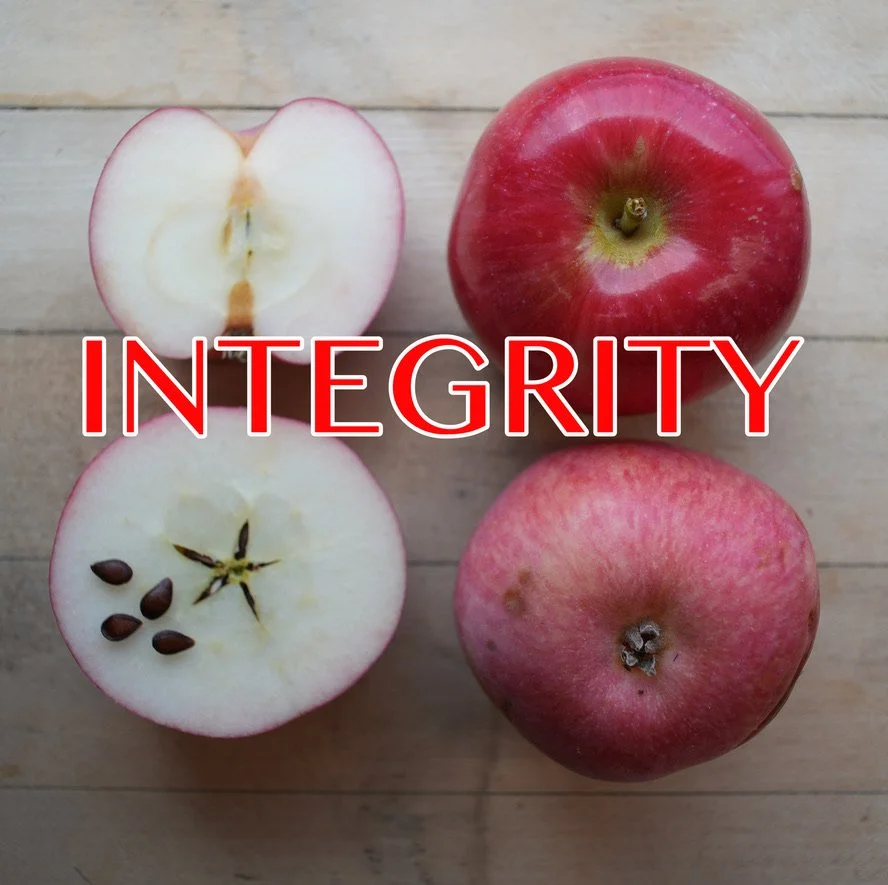Integrity is a cross between Williams’ Pride and Vixen. It is an early pie apple that holds its shape when cooked. I would not say it is much good for eating out of hand, so it has a narrow niche of use in pies, cobblers, apple betty etc.